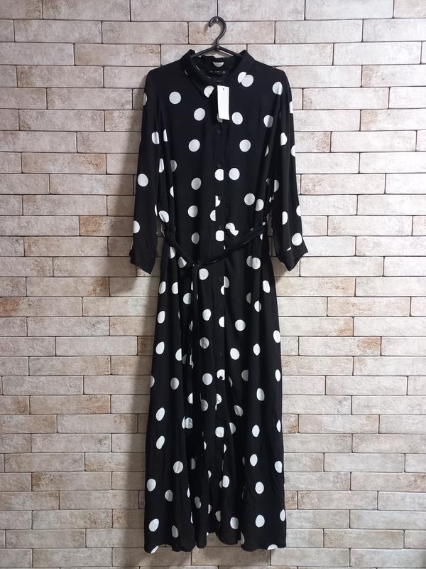 Платье макси на пуговицах от бренда F&F. Горловина оформлена аккуратным отложным воротником. Фасон расклешенного кроя к низу. По талии фиксируется поясом. Рукав 3/4, свободного кроя. Очень удобная практичная модель платья. Подойдет на размер 54-56. Состав: 100% вискоза.