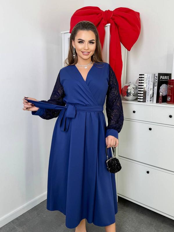 Длинное платье макси праздничное женское с декольте приталенное с поясом 48-66 Ткань: софт+гипюр. Цвета: марсала (бордово-фиолетовый), темно-зеленый, красный, индиго (темно-синий), электрик (ярко-синий), черный. Размеры: 48-50, 52-54, 56-58, 60-62, 64-66. Длина платья: 123, 124, 125, 126, 127 см. Длина рукава: 62, 62, 62, 62, 62, см. Обхват рукава: 37, 39, 41, 43, 45 см. Замеры готового изделия: 48-50 ОГ 102 ОТ 73/104 ОС 152 52-54 ОГ 110 ОТ 80/112 ОС 160 56-58 ОГ 117 ОТ 87/120 ОБ 167 60-62 ОГ 124 ОТ 94/128 ОС 174 64-66 ОГ 131 ОТ 101/128 ОС 181 На модели показан этот размер 52-54❗️ Рост модели 169 см. Объемы модели: ОГ 105, ОТ 82, ОБ 111 см. Невероятно женственное нарядное платье в вечернем стиле, длинной миди. Платье выполнено из ткани софт (растяжимости нет). Лиф и юбка имеют запАх, по талии собрано на резинку. Рукава выполнены из очень красивого гипюра, на манжете. Пояс из основной ткани в комплекте. Карман и застежек нет. Код 3768 НФ4426 📷Фото и видео реальные (живую) 🎥Смотрите видеоузор. Если Вы сейчас в приложении Шкаф, то, чтобы увидеть видео обзор, нужно скопировать ссылки на этот товар (с самого верха стрелка поделиться) и вставить его в любом браузере. В карточке товара, открытой в браузере, под фото увидите значок и надпись «Видео обзор». Нажмите на него для просмотра видеоохранения. ****************** 🚚 Условия доставки и оплаты: - Отправка Новой Поштой на протяжении 1-4 дней - Новая почта - с минимальной предоплатой 150 грн или полной оплатой. - Безпечна оплата на Шафі. - Обмен / обращение из почты или в ближайшие дни после примерки дома. - При заказе нескольких различных товаров из ассортимента магазина - уточните предварительно или возможна отправка одной посылкой. ****************** ❤️Почему нам можно доверять? 🔄Беспроблемный обмен и возврат. 💳Есть наложенный платеж Новая почта с минимальной предоплатой 150 грн. 📝Есть отзывы на Шаффи. 📸Реальные фото и видеогляды. 📏Есть замеры одежды. | На связи 24/7 🧵Отшивается в Украине из качественных тканей.