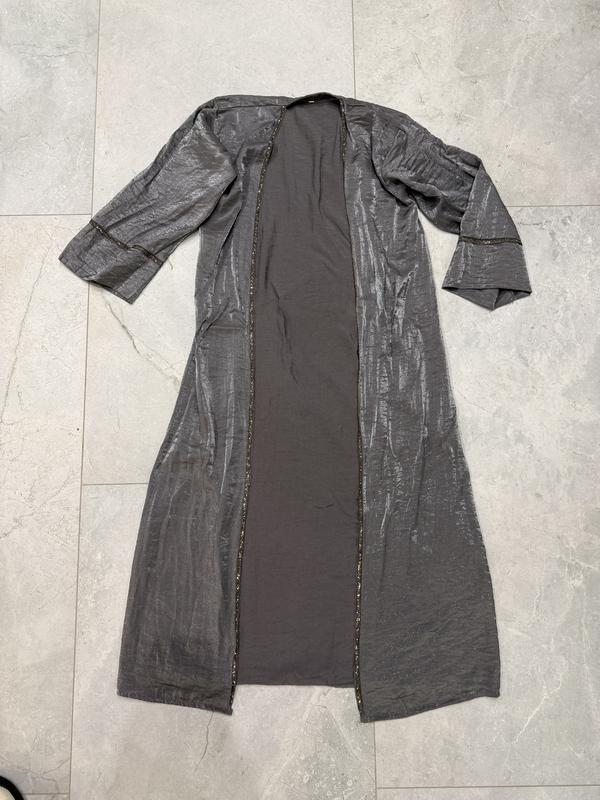 Комплект сукня з поясом, халат та хустка з Дубай. Дуже класна тканина та якісне пошиття. В чудовому стані (є пара зацепок на сукні, не впливають на загальний вигляд). Розмір зазначений 54, але гарно буде дивиться на M-XL