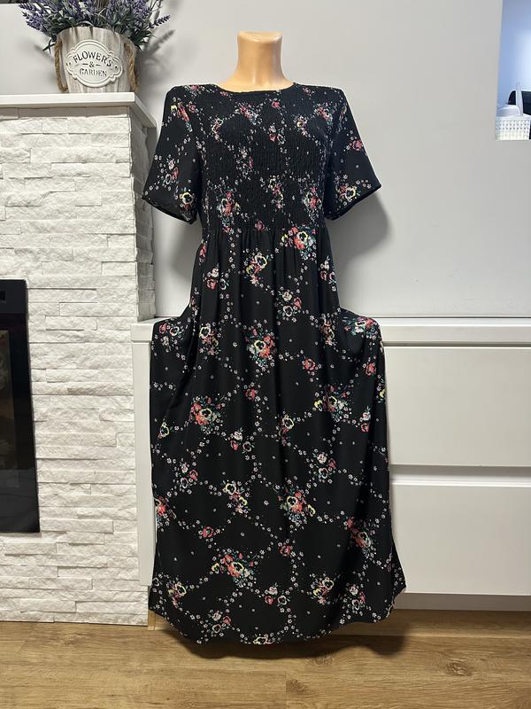 Гарна сукня з драпіровкою на грудях Вільного фасону Ткпнина в квітковий принт на темному фоні Р.л-хл Довжина125 Пог52 Талія45 резинка Бедра вільні