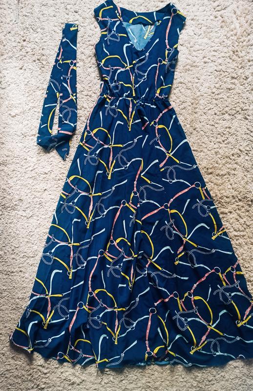 Легкое яркое платье в морской принт с юбкой, с поясом, сквозняк" с плечом.