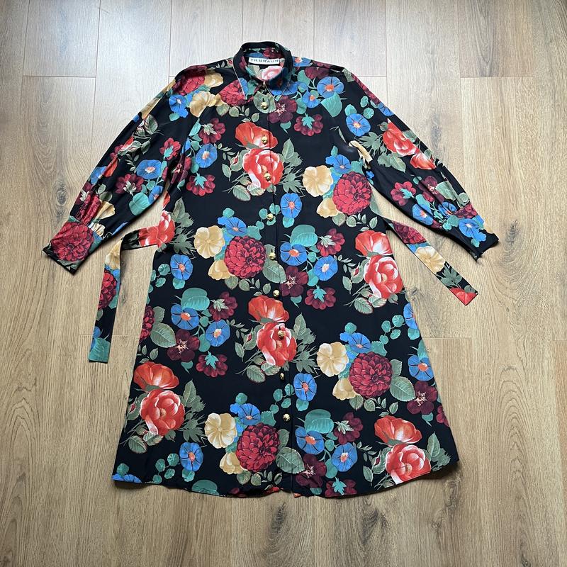 Крой свозной. Фото на вешалке показывает что должно собираться так, потому что пояс не длинный. Размер L. Застежка на пуговицы, форма льва. На рукавах манжет длинный который тянется. По бокам идет распарка на пуговицах. 100% шовк. Рукав от шеи 73 Рукав от подмышки 41 Груди 57 Ширина по центру 70 Ширина внизу 95 Длина 110