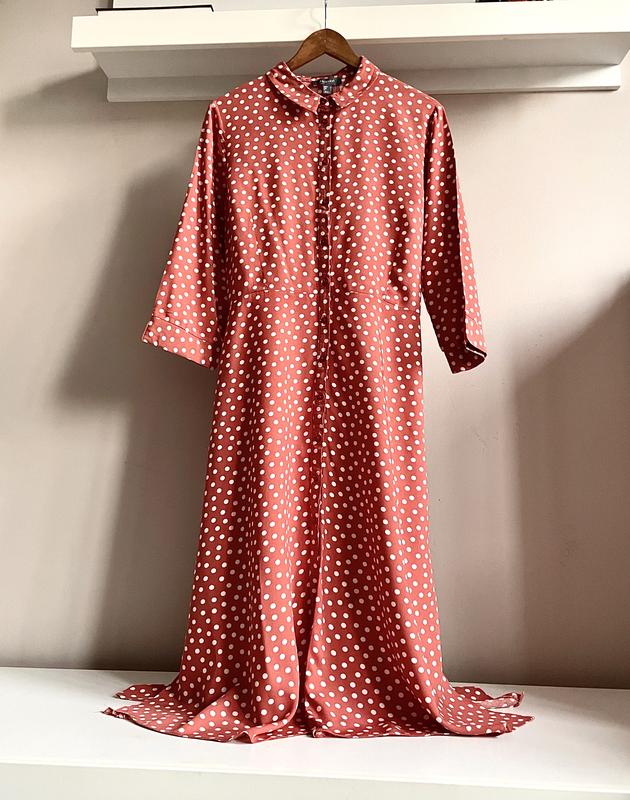 Легке,приємне,низпадаюче плаття в горошок,красивого теракотового кольору,стильне і зручне,відмінної якості та крою.Заміри дивіться на фото.Довжина 117 см