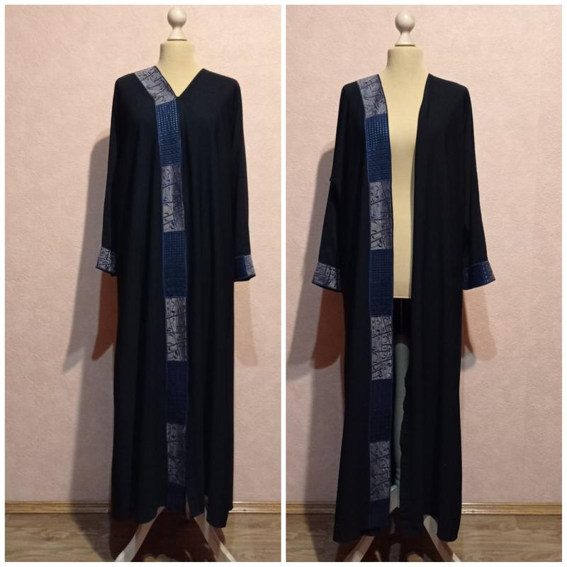 Легкое длинное платье-накидка, абая в восточном стиле. Легкое платье-накидка, абая в восточном стиле свободного, немного расширенного книзу силуэта, украшено каймой с красивым узором по всей длине и на рукавах. Такой силуэт хорошо стройнит фигуру. Ткань приятная на ощупь, не мнется и хорошо держит форму. Застегивается на кнопки. Носить можно как платье или как накидку. Размер 52-54. Длина 140 см. Длина рукава 56 см. Полуобхват груди 62 см. Полуобхват талии 66 см. Полуобхват бедер 70 см.