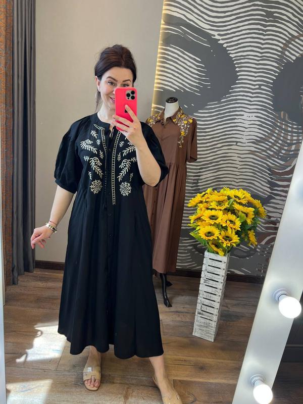 роскошное платье свободного кроя это идеальное сочетание комфорта и утонченного стиля, оно выполнено из мягкого эластичного коттона, украшенного изящной вышивкой на груди, небольшой воротник-стойка дополнен изящным шнурочком, добавляя образу легкости и воздушности. романтичности, пышные рукава на манжетах придают женственности, а эффектные защипы на груди красиво подчеркивают красоту фигуры, ниже талии платье мягко расширяется, создавая свободный и комфортный силуэт, практичные карманы добавляют удобства, делая платье не только стильной, но и очень удобной, идеальный выбор для тех, кто ценит комфорт и качество размер оверсайз 46-50 длина 124 см, объем груди по изделию 114 см, длина рукава от шеи 44 см, бедра до 150 см