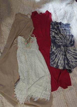 Красное платье размер ее М-L Бежевой размер S Черного с цветочками размер XL Майорр (комбинезон) размер XL цена за всю одежду 350грн можно по отдельности купить запить