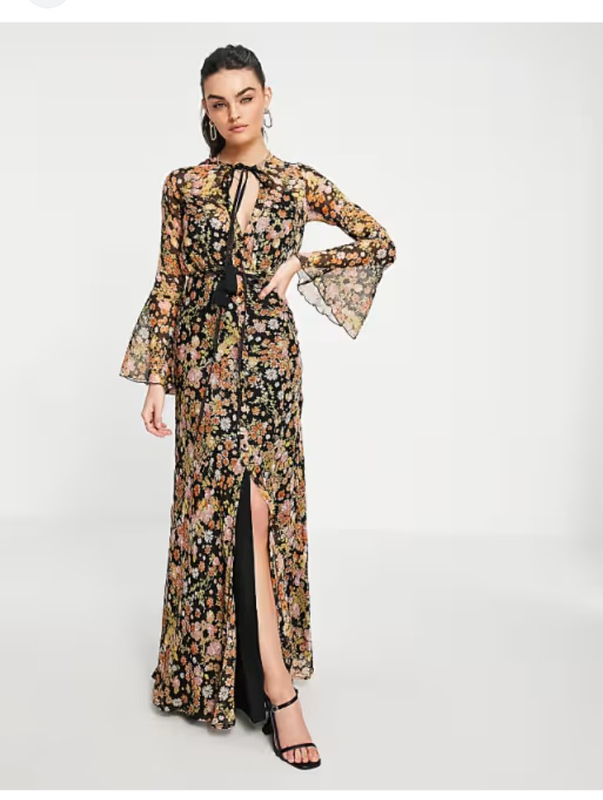 довга сукня в стилі бохо шик з тонкої прозорої тканини. підклад, акценті зав'язки , гудзики, обтягнуті тканиною, розкльошоні рукава , розмір М. Напівобхват грудей 44 см Напівобхват талії 36 см Напівобхват стегон 54 см Довжина 154 см