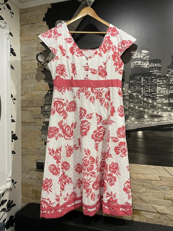 Якісна сукня сарафан в квітковий принт бренду Mark&Spencer зі 100% котону,білого кольору в червоні квіти,підкладка теж 100%,розмір англійський 18,заміри:ПОГ 56 см,ПОТ 48 см,ПОБ вільний,довжина 118 см.