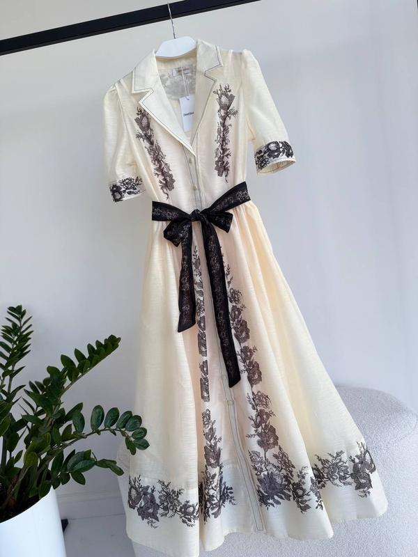 Сукня плаття бежева zimmermann довга льняна з візерунком та чорним поясом бант виріз декол...