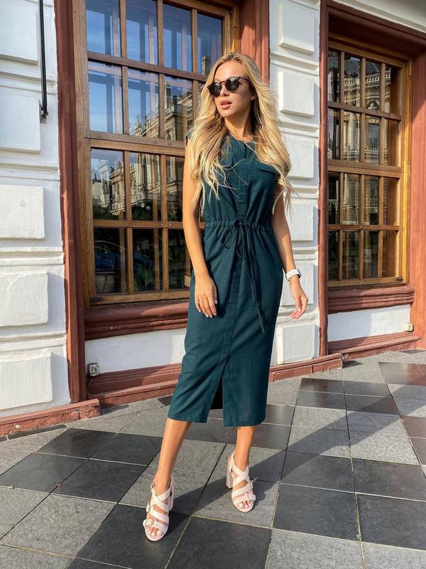 Платье Беж 42-44,54-56 Пудра 42-44,54-56 Зеленый 42-44 ткань-лен Платье женское льняное ниже колен с коротким рукавом, с карманами, затягивается на поясе