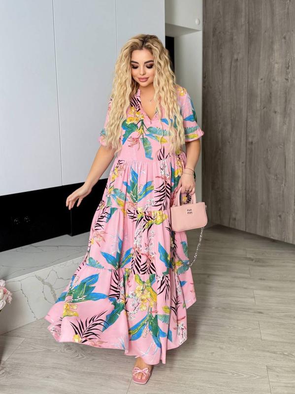 Женское летнее длинное платье макси с цветочным принтом в цветочек штапель розовое
