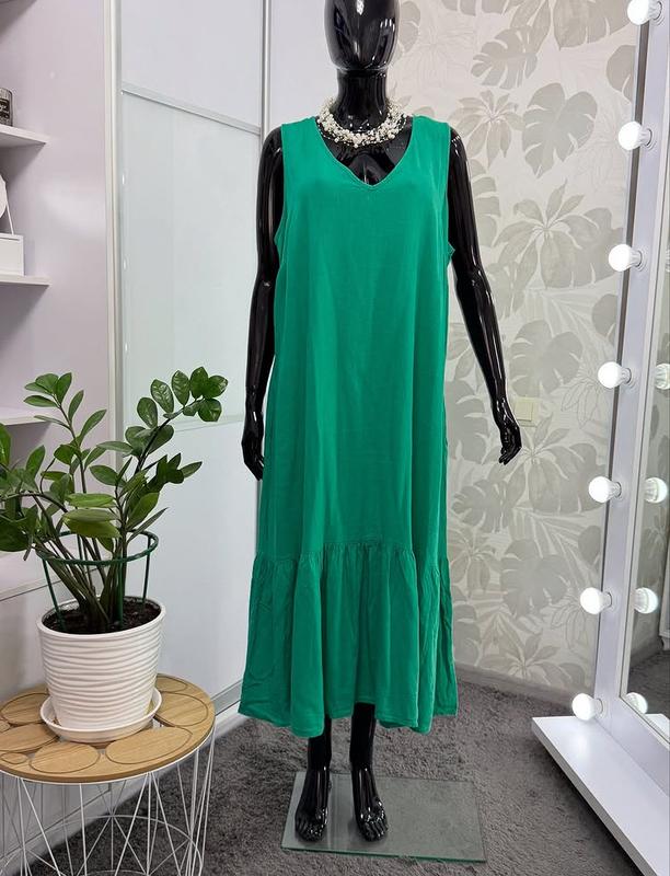 Сукня неймовірно красивого зеленого кольору. Тканина мʼяка, приємна на дотик, натуральна- суміш льону та віскози. V-подібний виріз робить акцент на декольте. Спинка відкрита трішки більше. Сукня має дві кишені. Практичний та зручний фасон. Довжина 127см Ширина в області грудної клітини 52см Ширина в області стегон 59см