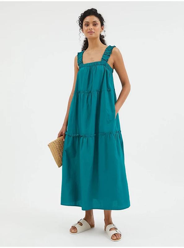 Сукня має зібрані бретелі на резинці. Також верх сукні (над грудьми) призібраний на широку резинку. Оригінальний квадратний виріз горловини та відкриті плечі є родзинкою цієї моделі. Сукня має багаторівневий дизайн спідниці та крій максі. Легка, натуральна тканина, приємна на дотик. Колір просто неймовірний - бірюзовий. Довжина 128см Ширина під руками 40см (тягнеться до 64см) Ширина в області стегон 74см