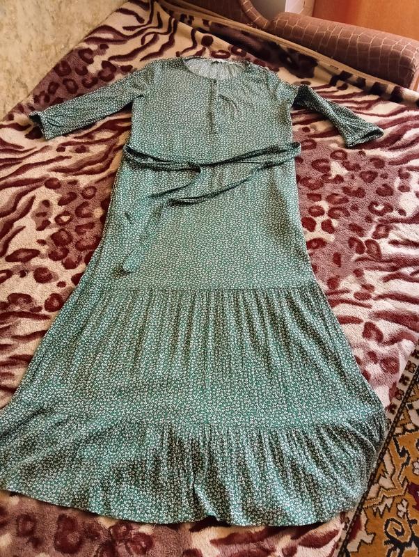 Отличное легкое летнее платье в виде нового, красивого летнего принта, едва заметная удобная жатка, тянется, приятная к телу, красиво падает, свободная, есть пояс, вантзу два непишевых волана. Рукав 3/4, с резиночкой внизу рукава. На вырезе пуговицы. Есть карманы. К сожалению ко мне малая, того продаю. Торг возможен, безопасная оплата, возврат поговоренности. длина 125 см рукав от горловины 50 ног 49 нот 47 нос 49 ширина по волану внизу по шву 56