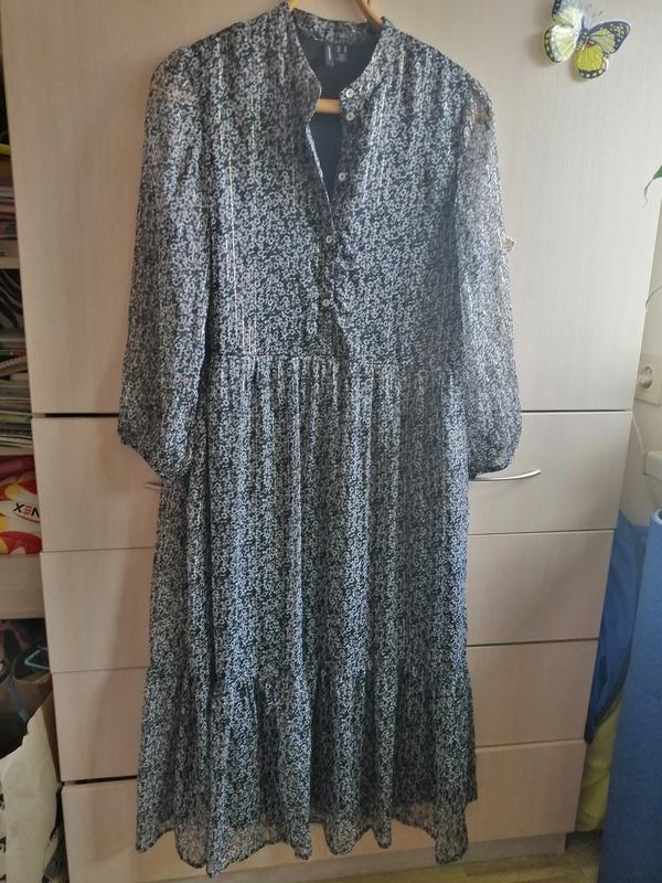 Красивое длинное шифоновое платье на пуговицах, свободного кроя, в цветочный принт, с металлизированной нитью, на подкладке, с длинным рукавом на пуговицах, по низу волан. Без кишень.