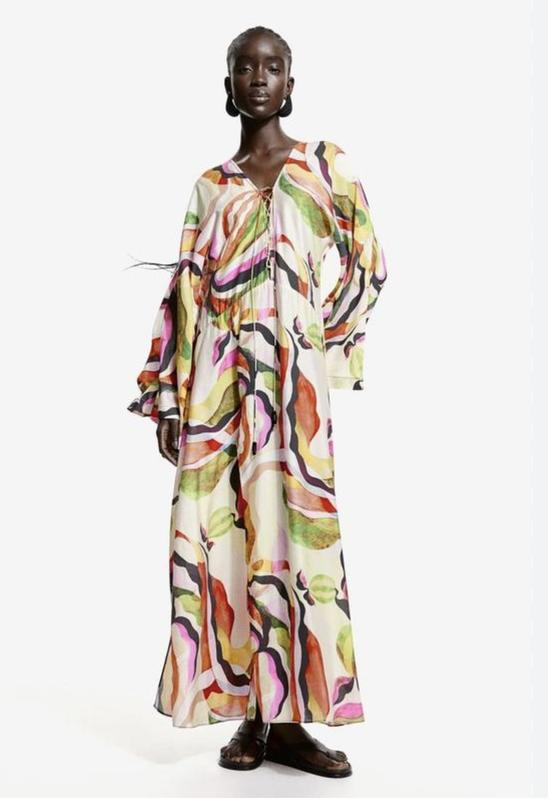 Сукня-кафтан з обʼємними широкими рукавами, V-виріз з декоративними завʼязками; тканина преміум якості - натуральна віскоза. Розмір S підійде і на М Довжина 140 см Рукав від горловини 70 см ПОТ 41 см ПОС 58 см Стан нової