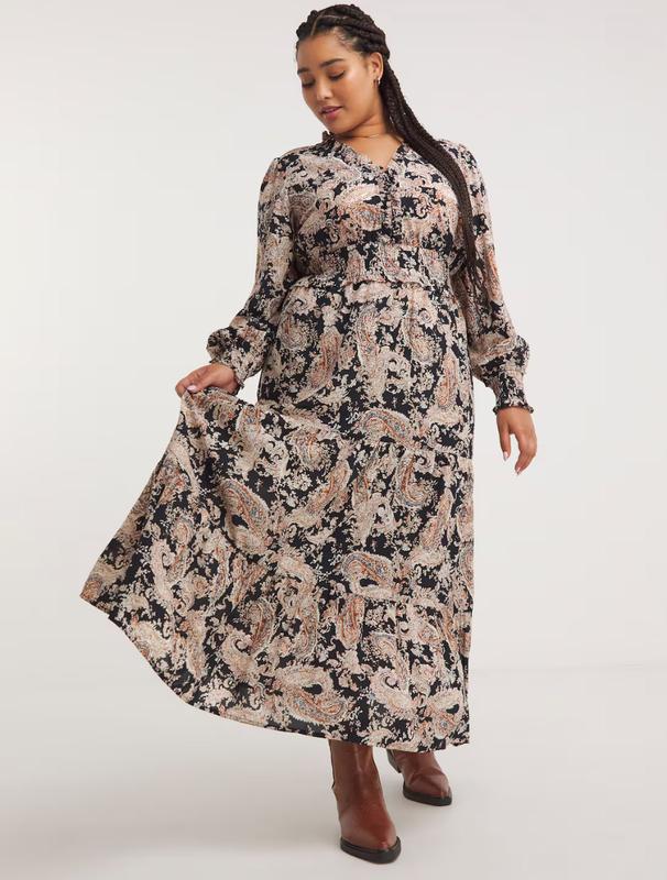Пречудова довга сукня в принт пейсли Великий розмір . По талії широка гумка . Виміри: ПП 46 ПГ 70 ПТ 50- 75 ПС 75 Довжина 142 Рукав 61