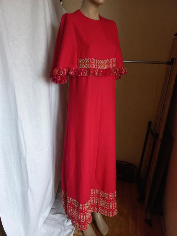 Приголомшлива тканина! Сделано в Финляндии. 100% шерсть. Очень хорошее винтажное состояние. NB! Цвет может немного отличаться в реальной жизни! ЧЕРВОНА ДОВГА ВОЛНИТЕЛЬНАЯ СУКНЯЯ С ФИНСКОГО ВІНТАЖУ 70-X-80-X POКІВ Красный шерстяной макси-платье 70-80-х годов, производитель Arola, изготовлена в Финляндии. Платье имеет короткие рукава-бабочки. Длинная молния сзади. Черная вышивка на груди и подолу. Платье расклешенное в сдержанном А-силуэти. Платье на подкладке. Высококачественная шерстяная ткань из чистой новой шерсти, подкладка 100% ацетат, химчистка. Размер S