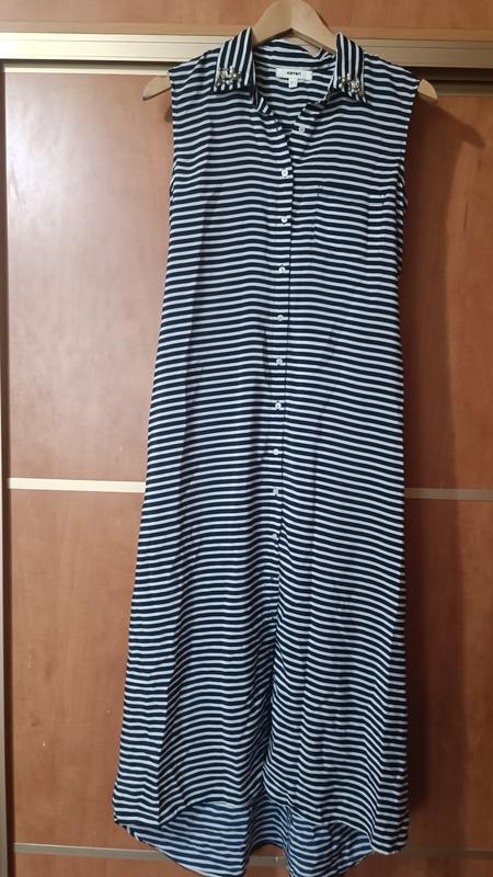 длинное платье рубашка, пуговки рабочие, актуальная полоска, на воротниченке отделка бусины, под поясочек