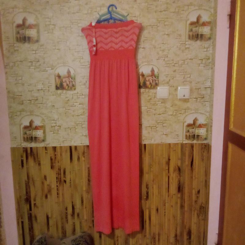Платье длинное, летнее, без бретелей,мывает дырку Цвет персиковый.Размер 40-42,можно подлетка Ткань приятная,версизонка,трохи тянется.В самом низу присутствуют черные точки, стройт неброские