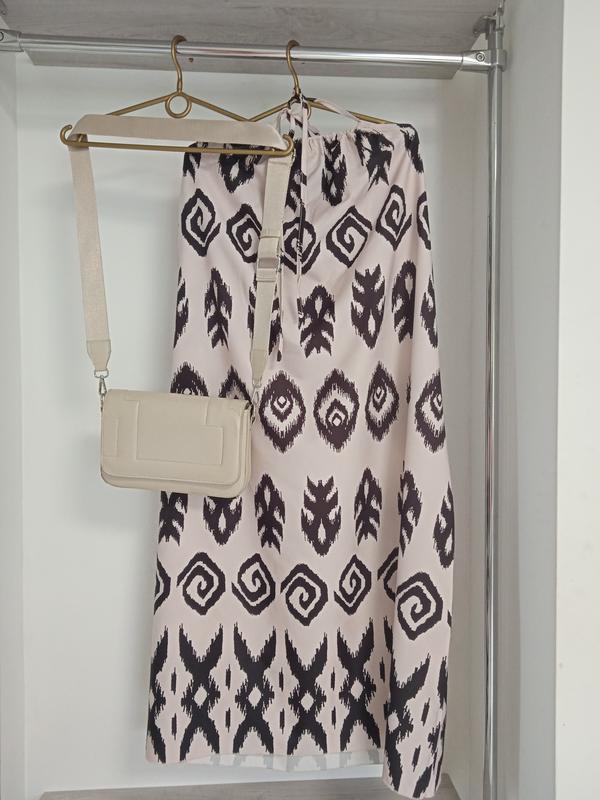 Классическое длинное платье с оригинальным контрастным рисунком. Легкое и комфортное. Открытые плечи. Фиксируется завязками на шее. Ложится свободно. Фасон-легкая трапеция. По спинке на резинке. Длина макси. Тонкая, но плотная ткань. Практически не тянется. Есть размеры.