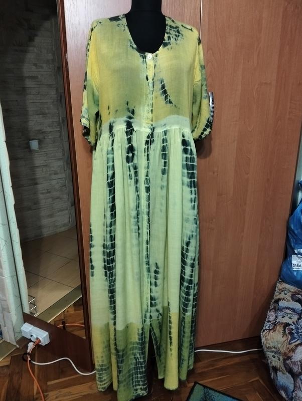 Заказа принимаю от 100грн. Красивое, свободное платье в хорошем состоянии. Пышный крой, талия завита, натуральная ткань, жатка, яркий принт, на пуговицах - только юбка, карманов нет. Платье в хорошем состоянии, но есть дефекты: подмышками немного катышков, незначительная потеря цвета, сбоку при глажке показало пару неприятных пятен, возможно Ванишем можно вывести не пробовала, выложила дефекты в последних фото. В цене все это учитывала. В целом платье, как домашнее, на дачу, или прогулку с собочкой. Размер 3-4XL: Длина - 130см; ширина - 41см; длина рукава - 27см; полуобхват по біцепсах - 21см; ПОГ - 57+см; ПО бедрах - свободно. Фото выполнено на манекене 34 размера, и принимайте это во внимание. Возвращение или обмен нет, пожалуйста, обдумывайте, делайте покупку. Оплата и доставка: Оплата на карту ПриватБанк - 100% Если пользуетесь "Беспечная оплата" (через Шкаф),роны втрое внимательно продумывать покупку, задавать вопросы, любите фото, чтобы не поворачивать, обязаная продавца оплачивать доставку вам и назад, давайте уважать друг друга! Отправка по Новой почте, Justin, Розетке и Укр-почтению. Пересласка за счет покупателя.