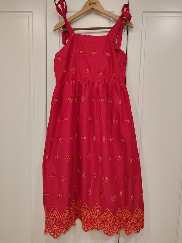 Летнее платье из прошвы. Имеет подклад, шлейка регулируется, резинка на спине. Цвет более малиновый.