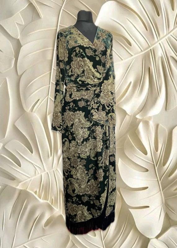 Неперевершена оксамитова сукня глибокого смарагдового кольору!Ця сукня – справжній витвір мистецтва, прикрашений візерунком у стилі "пейслі", що додає образу східної елегантності та королівського шарму. Виготовлена з м'якого, приємного на дотик оксамиту, вона ідеально сідає по фігурі, підкреслюючи ваші переваги та забезпечуючи неперевершений комфорт протягом усього вечора. Оригінальний крій та елегантні деталі роблять цю сукню ідеальним вибором для тих, хто прагне виглядати бездоганно. Чому саме ця сукня стане вашим фаворитом? Розкішний Оксамит: Ніжний та благородний матеріал, що дарує відчуття тепла та комфорту, а також візуально виглядає дуже дорого. Унікальний Золотий Візерунок: Ексклюзивний орнамент "пейслі" привертає погляди та робить ваш образ неповторним. Елегантний Дизайн: Сукня, яка ідеально підходить для урочистих подій, вечірок, святкових зустрічей чи будь-якого заходу, де ви хочете справити незабутнє враження. Універсальність: Легко доповнюється різноманітними аксесуарами, дозволяючи вам створювати унікальні образи. Будьте в центрі уваги! Не пропустіть шанс додати цю перлину до свого гардеробу! Замовте зараз і відчуйте себе справжньою королевою! Розміри: Рукав - 62см; Довжина - 130см; Талія - 80 см; Плечі - 40 см.