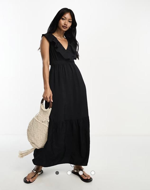 Черное платье без рукавов с воланами и воротником River Island. Длинное женское платье перекрестного кроя, с рюшей внизу и рукавами в форме крыла. Отрез на талии. Базовый элемент вашего сезонного гардероба, однотонная ткань, запитайный крой. Макси-платье элегантные и женственные, и это не исключение. Сочетайте ее с сандалиями на плоском каблуке для создания простого, беззаботного летнего образа или с туфлями на каблуке для модного вечернего образа. ✨ Размер 10 ✨Состояние: идеальный ✨Замеры: ✨Состав: