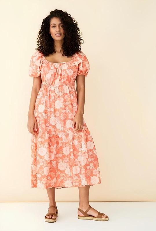 Чарівна довга ярусна сукня помаранчева F&F у квітковий принт. Натуральний склад: віскоза + бавовна. Має чудовий вигляд! Розмір : UK 8; EUR 36 Заміри: довжина 130см, до талії 38, рукав 24см, плечі 38см, пог 48см, пот 33см (на резинці до 45см), поб 56см Слад :82 катон, 18 віскоза Состояние: Идеальное Цвет: Коралловый Белый 56