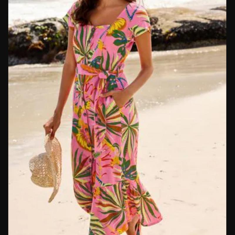 платье next состав лен, вискоза цвет розовый Принт растительный размер 40 евро замеры полуобхват груди полу охват талии полуобхват бедер длина застежка на пуговицы по всей длине круглый вырез платье клеш с оборкой боковые кошени