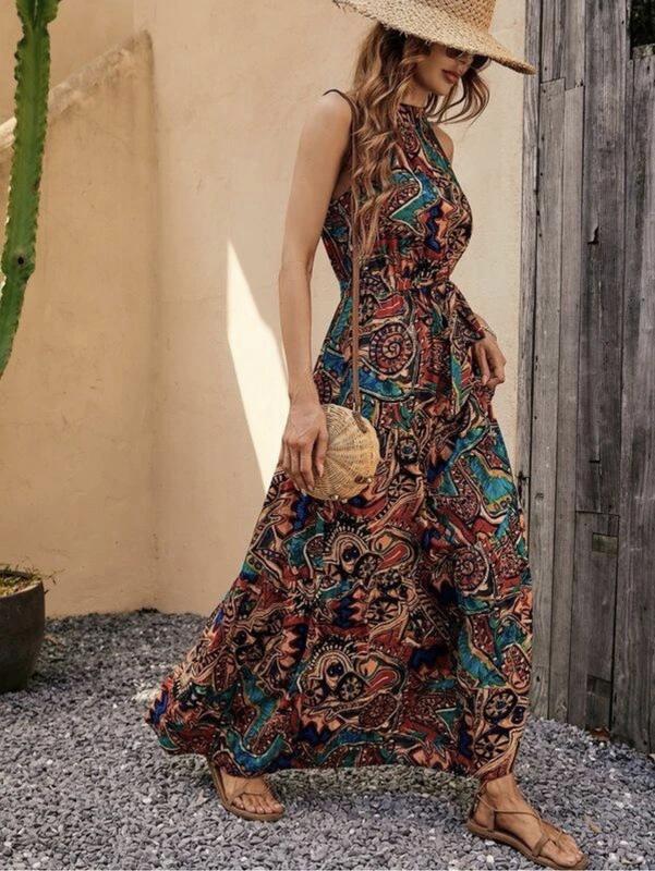 Довга сукня в бохо стилі в гарному стані. Розмір S, підійде і на М. Тканина поліестер, але на дотик як віскоза, не жарке. Довжина від плеча 126, довжина від пахви 104, пог 49, пот 31/49 (кругова резинка), стегна 54