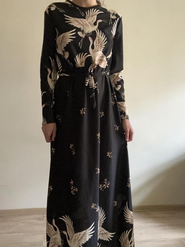 Довге чорне плаття з журавлями з пояском Ріст моделі 170 Розмір S Фактичний розмір XL, але сіло як оверсайз
