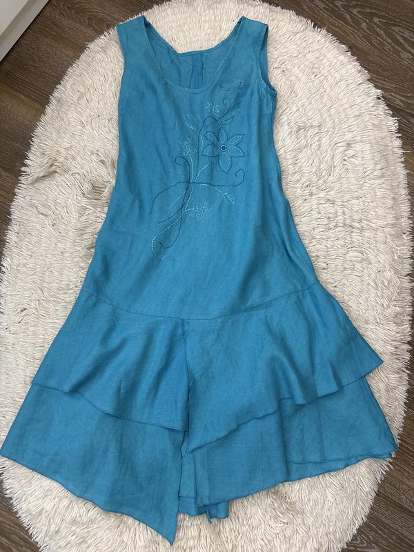 Очень красивое платье Ярко бирюзового цвета Лен высокого качества Пог 47 Длина 113 Нюанс на последнем фото Если не знать то незаметно