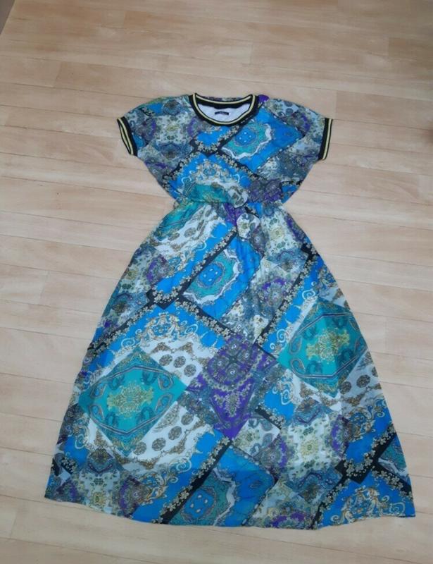 Длинное свободное платье PBL. Самая легкая полупрозрачная ткань сверху. Снизу - белый эластичный подъюбник с майкой. Края рукавов и горловины - трехцветная резинка. Пояс на резинке. Рoзм.44/XXL/52 Длина платья - 134 см Длина юбки - 90 см Полуширина подола - 95 см ПОБ - 75 см ПОТ в спокойном состоянии - 32 см, тянется до 55 см ПОБ - 56 см