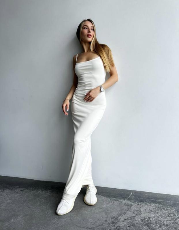 Ця сукня створена для тих, хто любить поєднання елегантно простоти та комфорту. Облягаючий фасон мʼяко підкреслює силует, а тонкі бретелі додають жіночності. Ідеальний варіант як на кожен день, так і на особливі події. Переваги моделі: Матеріал: мікродайвінг - тонкий, еластичний і приємний до тіла. Тканина має легкий шовковистий блиск, не просвічує, н сковує рухів і чудово сидить по фігурі. Фасон: облягаюча міні або міді (залежно від моделі), на тонки регульованих бретелях. Виріз - округлий або злегка V-подібний. Посадка: чудово підкреслює талію, стегна та лінію плечей, візуально подовжуючи силует. Універсальність: підходить як для вечірніх виходів, побачень, фотосесій, так і як база під жакет чи кардиган у повсякденно образі. Колір: молочний - мʼякий, теплий відтінок білого. Виглядає дорого, витончено та святково, особливо на засмаглій або світлій шкірі. Параметри: XS-S Напівобхват грудей 38,5 см Напівобхват стегон 40 см Довжина виробу 142 см M-L Напівобхват грудей 42 см Напівобхват стегон 43,5 см Довжина виробу 143 см XI-XXL Напівобхват грудей 45,5 см Напівобхват стегон 47 см Довжина виробу 144 см