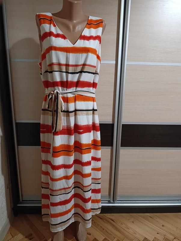 Вказано розмір 18 Довжина 123см ПОГ 54,5-56см ПОТ 52-53см( стягується пояском) ПОБ приблизно 57-58см Є підкладка По боках - розрізи