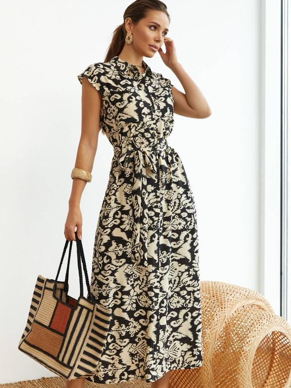 Летнее платье-рубашка из льна черная в принт | 90624