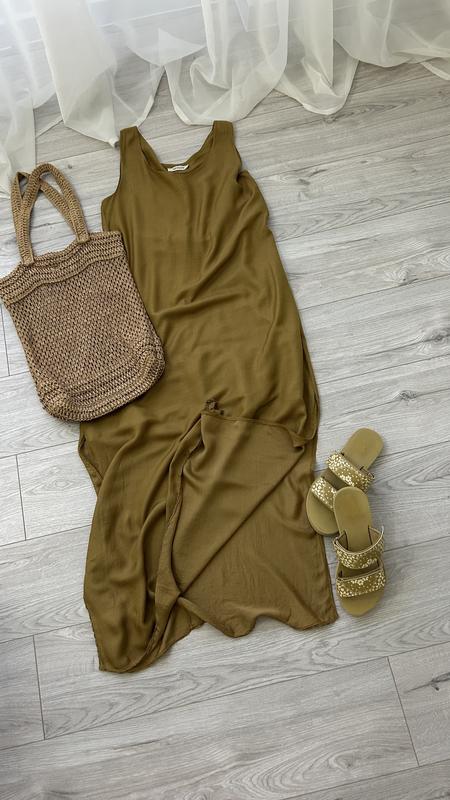 Ультралегка та практично невагома на тілі сукня з віскози та шовку, колір приглушений гірчиця, дуже гарно виглядає на засмазі. Довж 135см, пог 47, плечі 39, розріз з двох сторін по 50 см.