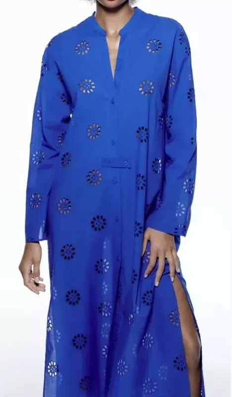 В новом состоянии. Синее платье из прошва от Zara свободного кроя с разрезами по бокам. Размер: XL Длина - 121 см Пог - 58 см Плечи - 49 см спущенные Рукав - 55 см