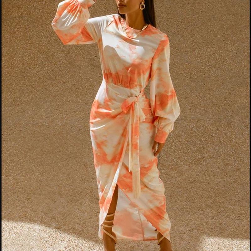 Платье длинное на запах юбка длинные широкие рукава буфы с поясом с кисточками принт абстракция легкая женская/ PrettyLittleThing. 95% Polyester. 5% Elastane. Цвет оранжевый, белый, светлый желтый. Размер указан Uk12/EUR40/US8/DE38. Может быть L. Линия груди 48-50 см. Линия талии 40 см. Плечи 38 см. Длина рукава 68 см, удлиненный. Ширина рукава зверху 19 см. Ширина рукава (буф/ найширша) 28 см. Линия бедер 52 -55 см +/- юбка на запах с поясом. Длина от плеча 155 см. Длина от плеча до пояса 40 см. Ткань легкая, немного просвечивает, слегка тянется по ширине. Сзади застежка- скрытая молния 58 см./ на талии пояс/ бант.