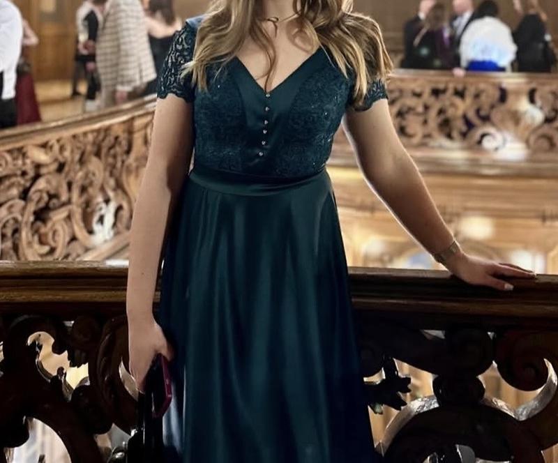 Вишукана вечірня сукня з мереживним верхом у смарагдовому кольорі 👗 Розмір: M, L ✨ Верх оздоблений витонченим мереживом із коротким рукавом 🔘 V-подібне декольте з декоративними ґудзиками — дуже жіночний акцент 🎀 Талія підкреслена атласним паском 🧵 Спідниця з легкої тканини, гарно струменить, не блищить 🧼 Стан: одягнена 2 раз на офіційний захід, ідеальний стан 💸 Ціна: 750