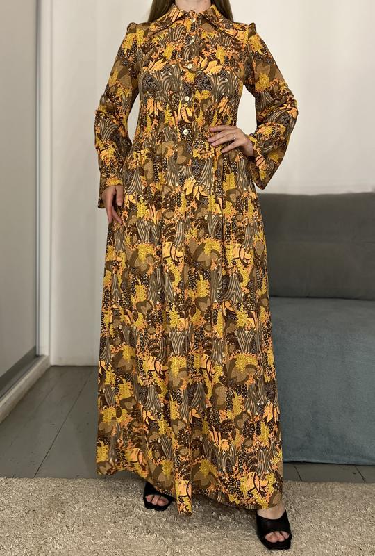 Для более точного определения, замеры, сравнивайте с измерениями подобной вещи, а не со своими объемами. Винтажное миди платье рубашка в стиле 70-х. Ткань плотная, не просвечивается, немного тянется. Застегивается на пуговицы. Талия отрезная, на широкой резинке. Юбка трапеция. Состояние: очень хорошее. Эффекты: нет. Размер на бирке: 12 рдинаторы изделия измеряются в полуобхвате, а не от шва до шва!ook Замеры изделия: Плечи 38 см., Рукав 61 см., высота проймы 20 см., Ширина рукава 18 см., Полуобхват груди 47 см., Полуобхват талии 41-55 см., Полуобхват бедер 76 см., Полуобхват низ 87 см., Длина по спине 141 см. Длина от плеча 141 см., Длина от плеча до талии 33 см. Состав ткани: не указан. Страна производитель: не указана. Бренд: Marie Howitt by Leodian Оплата и доставка: Оплата на картку монобанк. Брожение на оплату только 24 г. При изменениях цель покупать обязательно сообщайте! Доставка: На время введения военного состояния, уточняйте, возможна ли доставка до Вашего пункта. Актуальные новости можно уточнить на сайте перевозчика и по телефону контакт-центров. Не забудьте ПОДПИСАСТЬ, чтобы быть в курсе всех новинок и распродажей!