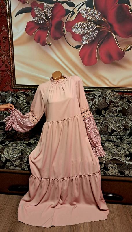 Длинное пудровое платье.рукава украшены по середине вязкой крючком'а дальше гипюр.длина 136.грудь 50-53.нижняя грудь шов 50.бедра любимые клешне.