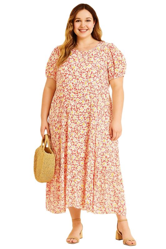 Эффектное платье в ромашки на коралловом фоне от Peacocks Сзади на змейке Размер 24 eвро, это 6XL Пог 65-69 см Пот 61 см Поб 77 см Длина 133 см Рукав 29 см Плечи 47 см