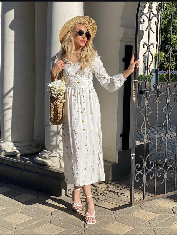 Довга, легка сукня з натуральної тканини на підкладці (спідниця). Верх відрізний. Позаду потайна блискавка. Стан ідеальний. Розмір вказано L. Тканина не тягнеться Довжина 130 Рукав 62 Плечі 41 По грудей 49+витачки По талії 41 По стегон 74(краще щоб вільно)