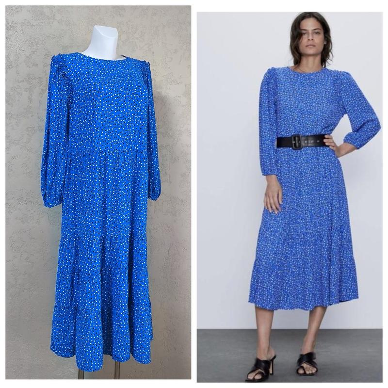 Синее платье-миди в горошек ZARA. Модель свободного силуэта имеет круглую горловину, длинный рукав с рюшами на плечах, отрезную линию талии, широкую юбку со сборками, астегивается на пуговицу сзади. ✨ Стан - идеальный ✨ РАЗМЕР L ✨ЗАМІРИ: ✨ Состав: 100% вискоза