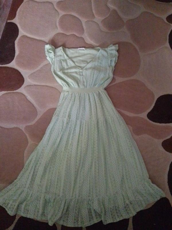 Отличное платье из собственного шкафа, не секонд. Нежно салатовый цвет, кружевная, на хлопковой подкладке. Красиво сядет на размер 50-52, на 48 будет немного свободно. Есть небольшая пятнышка спереди, есть на фото, учтенный в цене. ПОГ 50, талия 37, резинка, хорошо тянется, бедра свободно. Длина 124.
