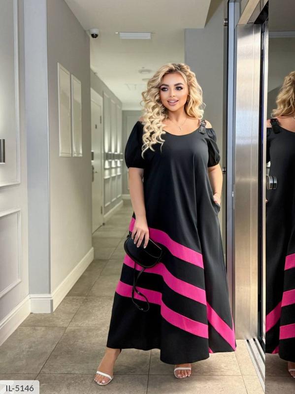 Сукня IL-5146 Размеры: 46-48, 50-52, 54-56, 58-60 Цвета: шоколад, малина, оранжевый, салатовый Тканина: коттон ( бавовна 97%, еластан 3% ) Платье свободного кроя с интересными элементами: на плечах застежки из кожи ( регулируется длина лямок). По низу платья спереди и сзади, на плечах цветные вставки. Рукава ниже локтя на резинке.
