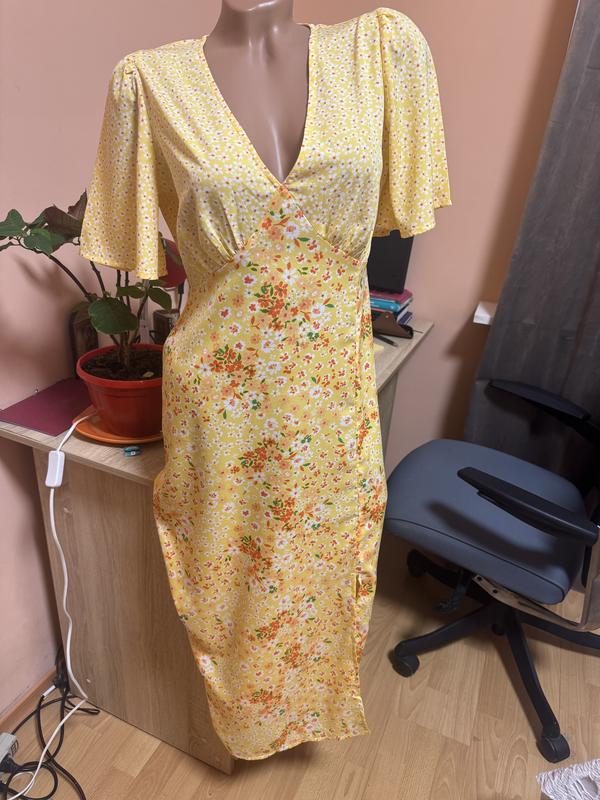 Елегантна сукня міді, квитковий принт. М’яко облягаючий крій плавно розширюється донизу, забезпечуючи комфорт і свободу рухів. Легкі рукави-крильця додають силуету романтичності, а V-подібне виріз гарно відкриває зону шиї та декольте. Збоку блискавка, на нозі збоку розріз. Ідеальна для вечірніх прогулянок , як в місті, так і на відпочинку 🌸🌸🌸. Довжина 123 см, , в груді 43 см, талія 40 см